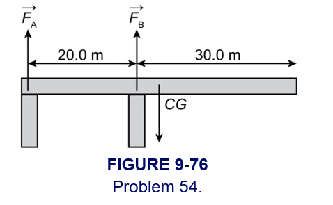 (II) Assume that the supports of the uniform cantilever shown in Fig. 9–76 \(m{\bf{ = 2900}}\;{\bf{kg}}\) are made of wood. Calculate the minimum cross-sectional area required of each, assuming a safety factor of 9.0.