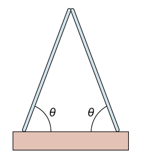 Two identical, uniform beams are symmetrically set up against each other (Fig. 9–87) on a floor with which they have a coefficient of friction\({\mu _{\rm{s}}} = 0.50\). What is the minimum angle the beams can make with the floor and still not fall?