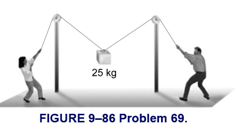 A 25-kg object is being lifted by two people pulling on the ends of a 1.15-mm-diameter nylon cord that goes over two 3.00-m-high poles 4.0 m apart, as shown in Fig. 9–86. How high above the floor will the object be when the cord breaks?