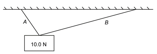 A 10.0 N weight is suspended by two cords, as shown in Fig. 9–44. What can you say about the tension in the two cords?