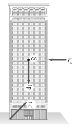 Question:A 50-story building is being planned. It is to be 180.0 m high with a base 46.0 m by 76.0 m. Its total mass will be about\({\bf{1}}{\bf{.8 \times 1}}{{\bf{0}}^{\bf{7}}}\;{\bf{kg}}\)and its weight therefore about\({\bf{1}}{\bf{.8 \times 1}}{{\bf{0}}^{\bf{8}}}\;{\bf{N}}\). Suppose a 200-km/h wind exerts a force of\({\bf{950}}\;{\bf{N/}}{{\bf{m}}^{\bf{2}}}\)over the 76.0-m-wide face (Fig. 9–80). Calculate the torque about the potential pivot point, the rear edge of the building (where acts in Fig. 9–80), and determine whether the building will topple. Assume the total force of the wind acts at the midpoint of the building’s face, and that the building is not anchored in bedrock. [Hint:\({\vec F_{\rm{E}}}\)in Fig. 9–80 represents the force that the Earth would exert on the building in the case where the building would just begin to tip.]
