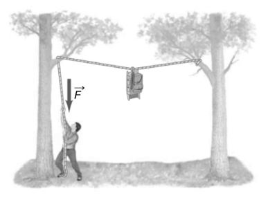 (II) The two trees in Fig. 9–51 are 6.6 m apart. A backpacker is trying to lift his pack out of the reach of bears. Calculate the magnitude of the force\(\vec F\)that he must exert downward to hold a 19-kg backpack so that the rope sags at its midpoint by (a) 1.5 m, (b) 0.15 m.